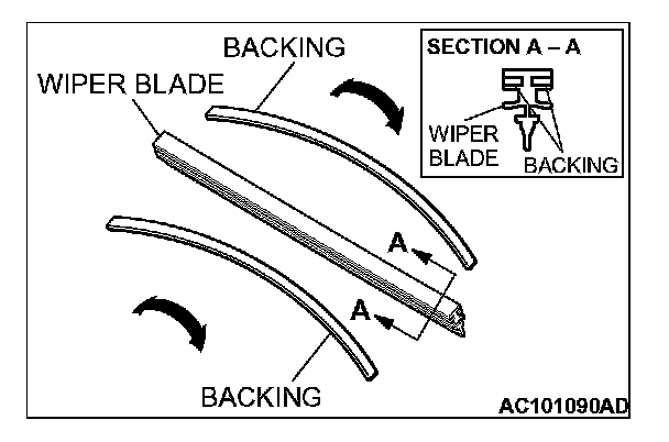 When installing the passenger's wiper blade, check that the backing inside the wiper blade is warped toward the wiper arm.