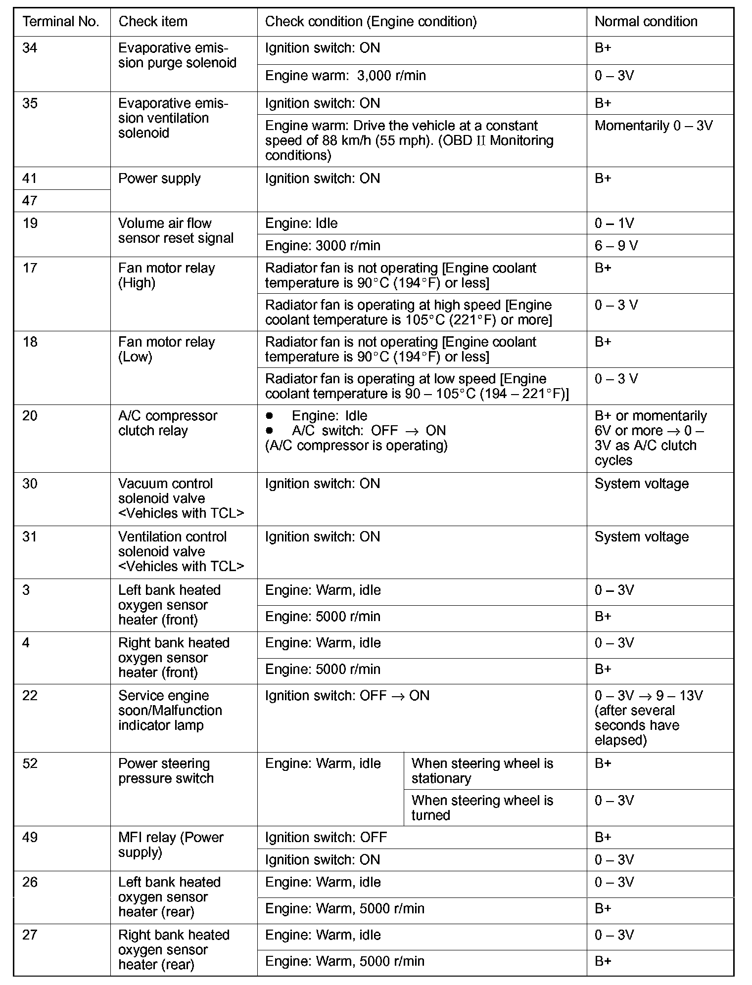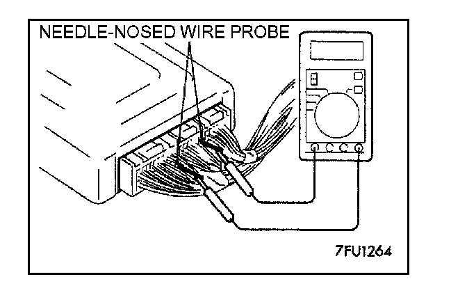 2. Insert the needle-nosed wire probe into each of the PCM connector terminals from the wire side, and measure the voltage while referring to the check chart.