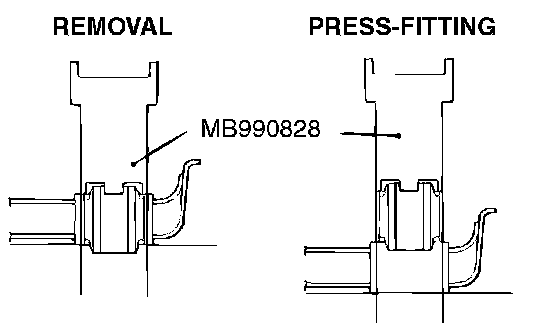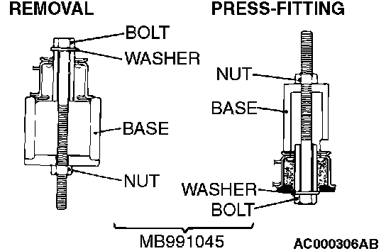 1. Use special tool MB990828 to drive out and press-fit the crossmember bushing C.