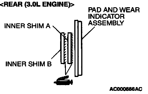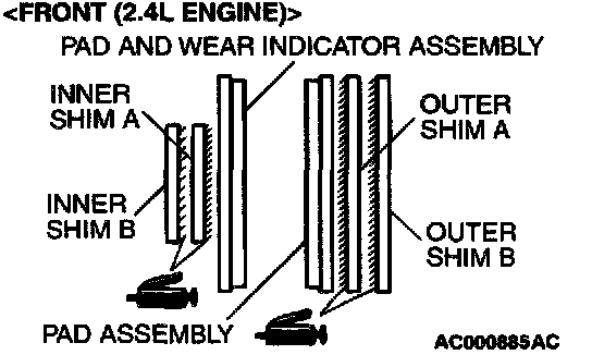 7. For front disc brake <2.4L ENGINE> and rear disc bake <3.0L ENGINE>, apply brake grease SAE J310, NLGI number 1 to the following positions before installing the pad.
