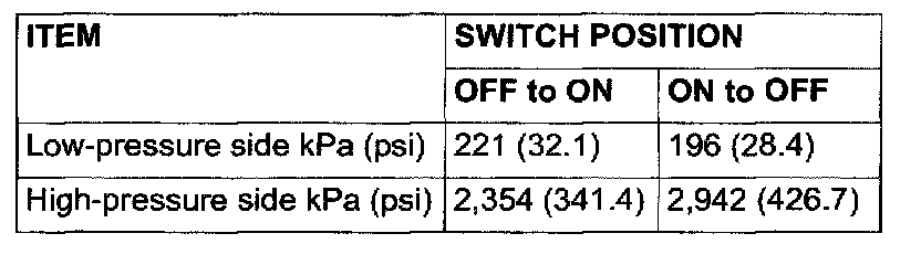 3. When the high/low pressure sides of the dual pressure switch are at operation pressure (ON) and there is continuity between the respective terminals, then the condition is normal. If there is no continuity, replace the switch.