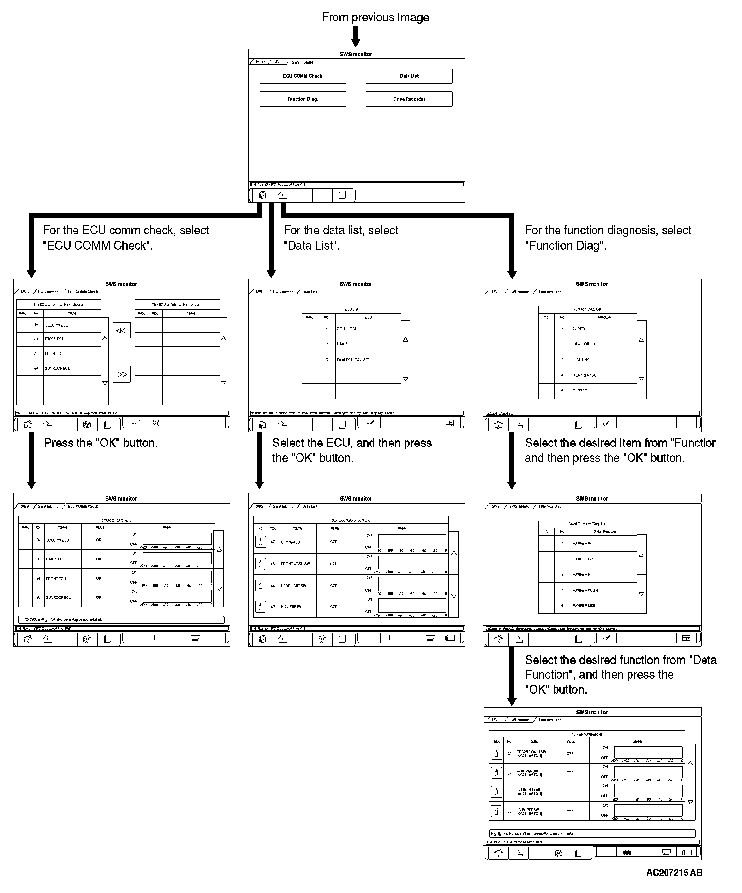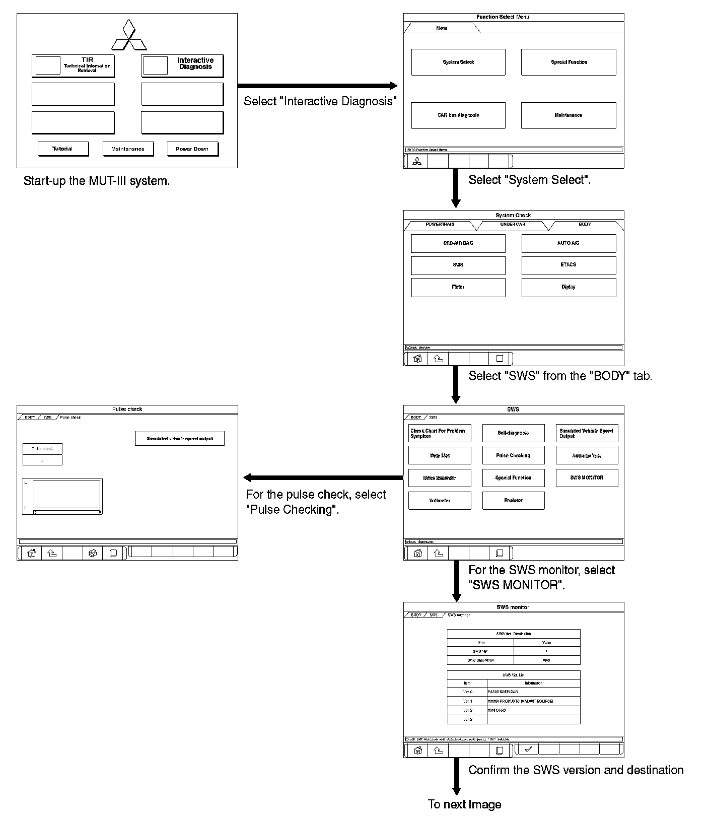 To carry out troubleshooting, operate scan tool MB991958 (MUT-III Sub Assembly) as shown.