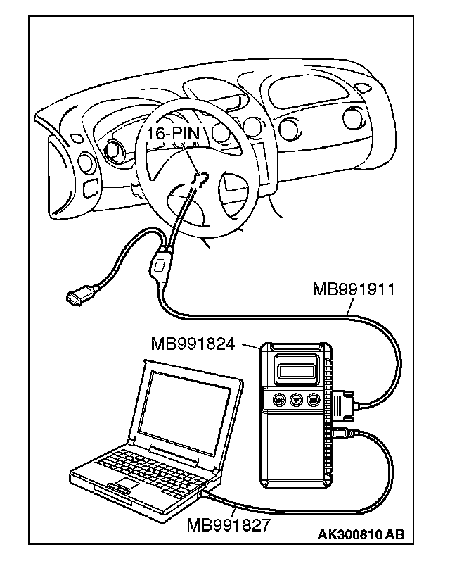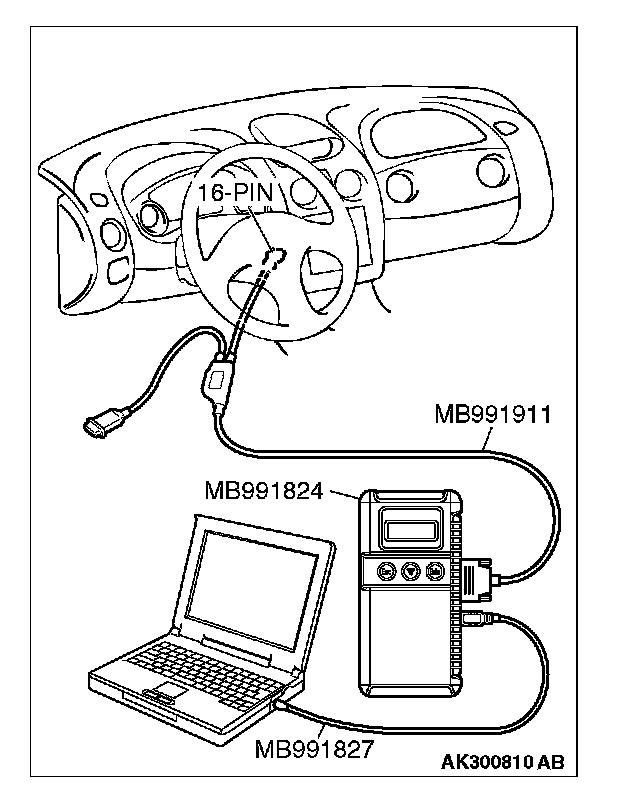 CAUTION: To prevent damage to scan tool MB991958, always turn the ignition switch to the "LOCK" (OFF) position before connecting or disconnecting scan tool MB991958.