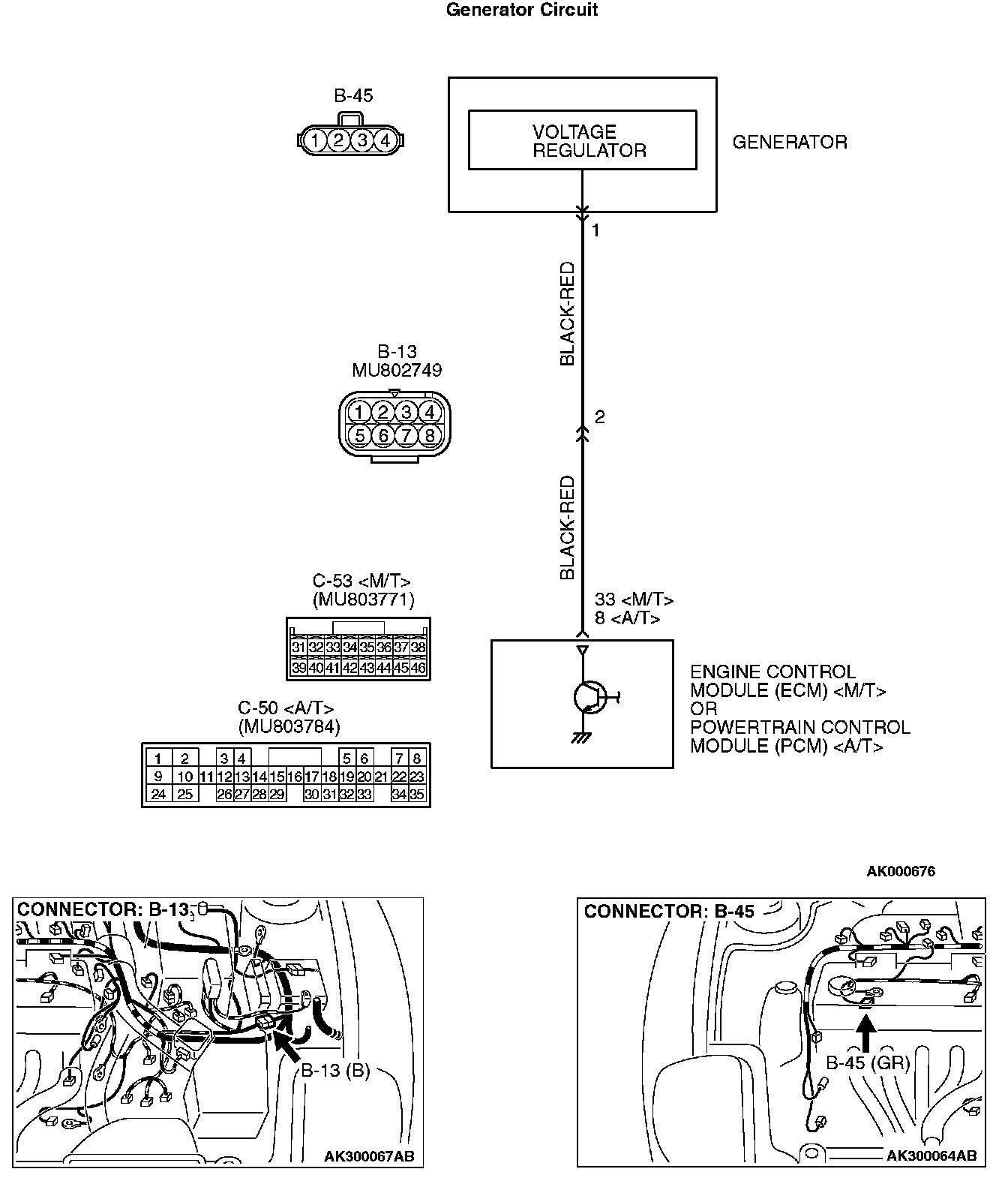STEP 5. Check for open circuit and short circuit to ground and harness damage between generator connector B-45 (terminal No. 1) and ECM connector C-53 (terminal No. 33)