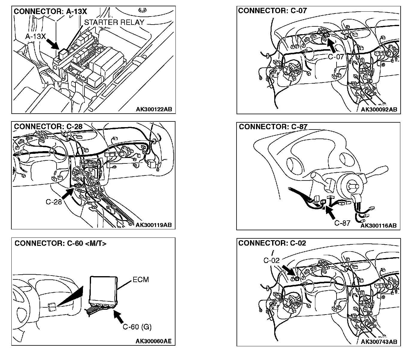 NO: Check connector C-28 at intermediate connector for damage, and repair or replace as required. Refer to Harness Connector Inspection. If intermediate connector is in good condition, repair harness wire between ignition switch connector C-87 (terminal No. 5) and starter relay connector A-13X (terminal No. 3, No. 5) because of open circuit. Then confirm that the malfunction symptom is eliminated.