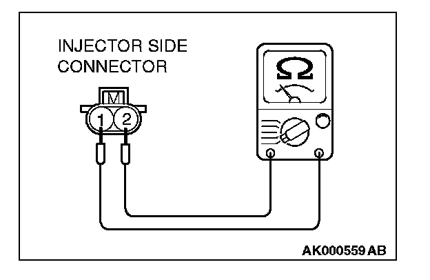 2. Measure the resistance between each injector side connector terminal No. 1 and No. 2.