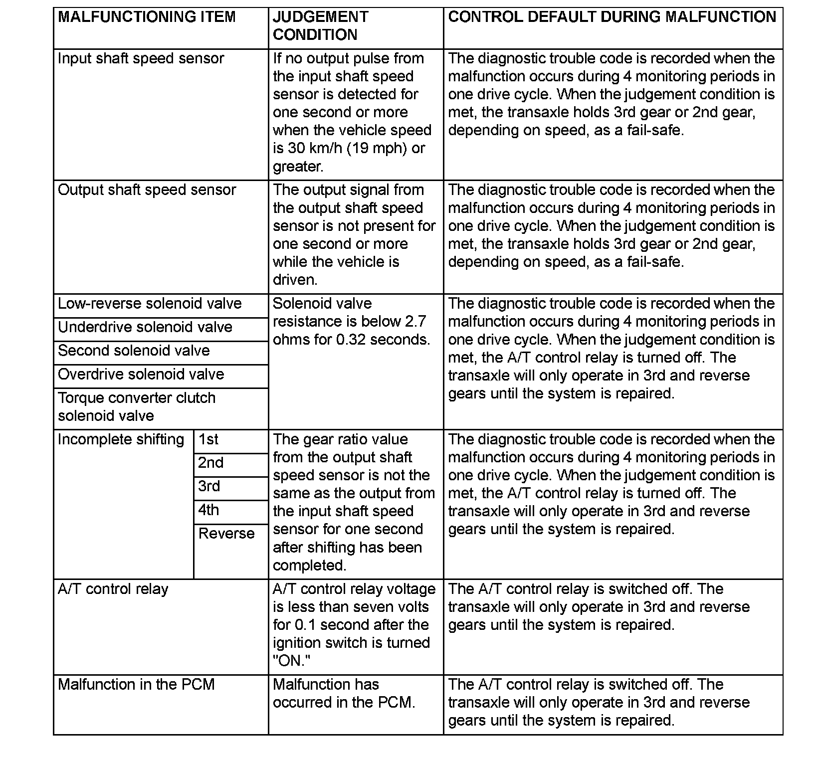 FAIL-SAFE/BACKUP FUNCTIONWhen a malfunction of a main sensor or actuator is detected by the PCM, the transaxle is controlled by pre-set control logic to maintain safe conditions for driving. The following table shows how the fail-safe/backup function affects vehicle driveability and operation.