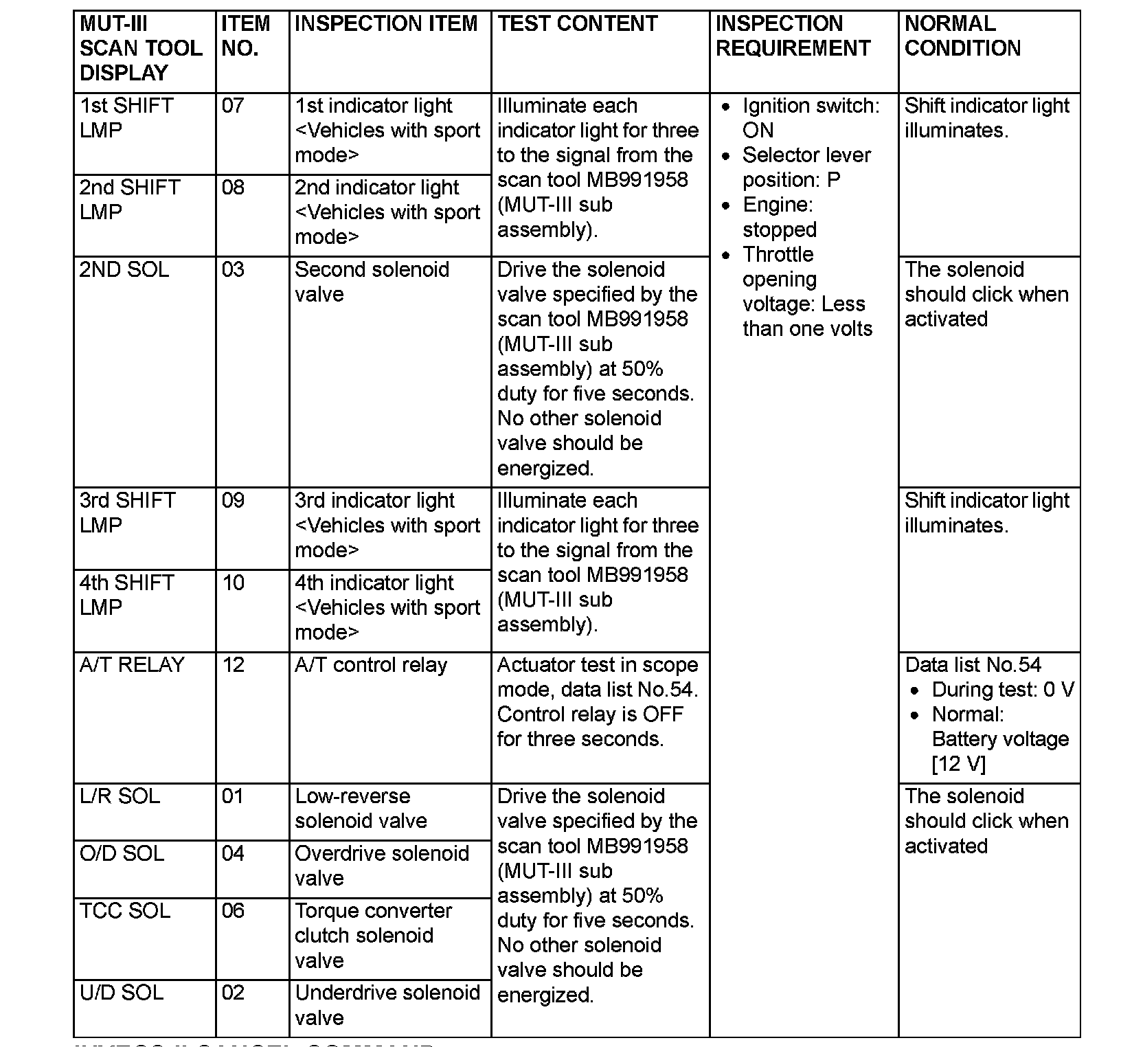 Actuator Test Reference Table