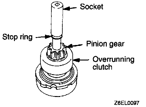 1. Press a long socket wrench of appropriate size to the stop ring. Then tap the socket wrench to remove the stop ring to the pinion gear side.