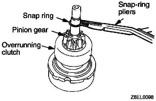 2. After removing the snap ring (by using snap-ring pliers), remove the stop ring and the overrunning clutch.