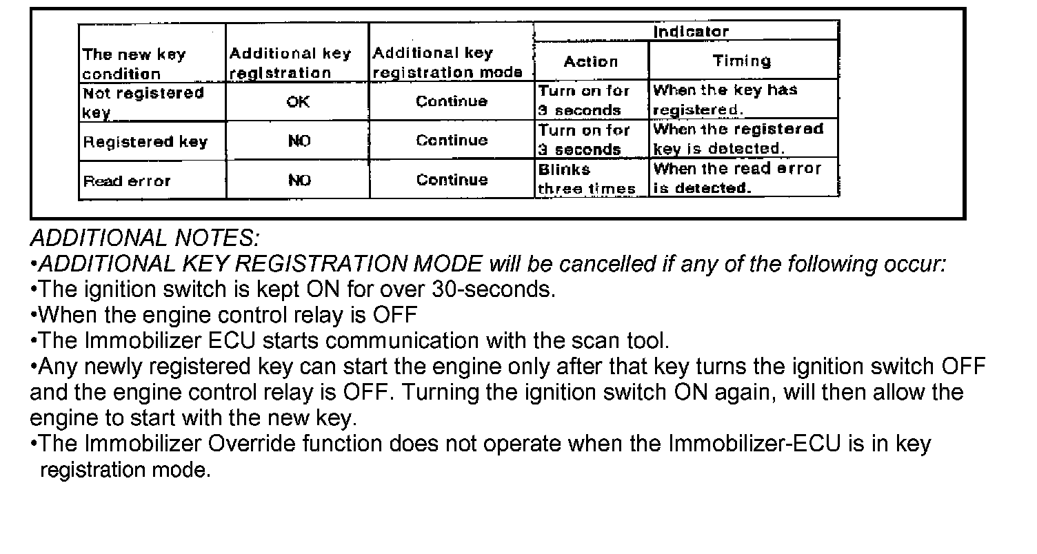 For 2002-04 model years, the Immobilizer ECU will allow registration of additional ignition keys using the new ADDITIONAL KEY REGISTRATION METHOD. By using this method, the scan tool and a password are not needed if at least TWO originally registered keys are available.