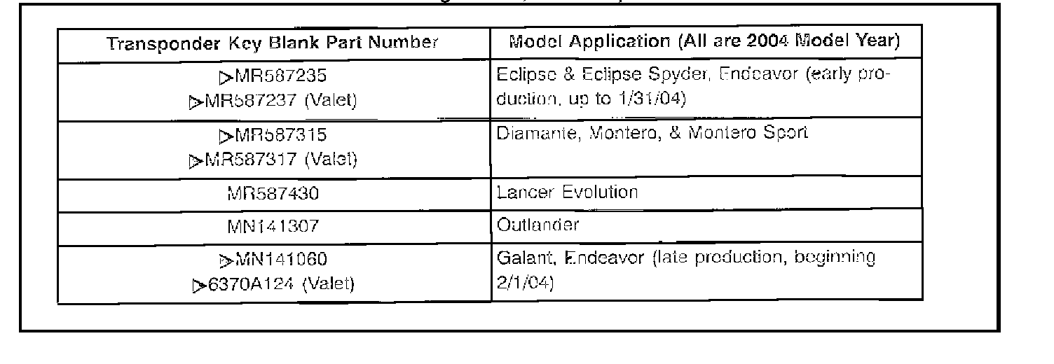 KEY BLANKS FOR 1999 AND EARLIER MODEL YEAR VEHICLES AND KEY BLANKS FOR 2002-04 LANCER (ES, LS, OZ Rally, Ralliart), 2004 LANCER SPORTBACK, 2000-02 MIRAGE, AND 2003 OUTLANDER ARE NOT TRANSPONDER EQUIPPED AND CANNOT BE REGISTERED FOR IMMOBILIZER EQUIPPED VEHICLES.