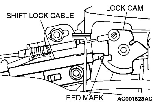 2. Fasten the shift lock cable at the position where the end of the shift lock cable is positioned above the red mark on the lock cam.