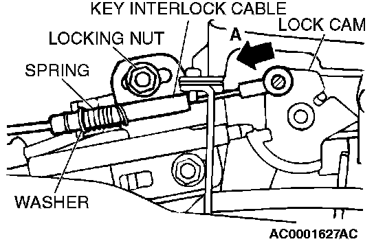 4. Lightly push the key interlock cable into the key interlock cable housing toward the arrow (A) direction until the cable movement stops and the cable end eye is aligned with the shaft on the lock cam. Tighten the locking nut. Snap the cable end eye onto the shaft of the lock cam.