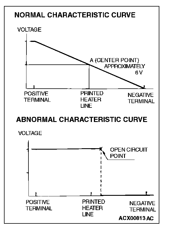 2. Turn "ON" rear window defogger switch. Measure heater element voltage with circuit tester at rear window glass centre A. Condition is good if it indicates about 6 V.