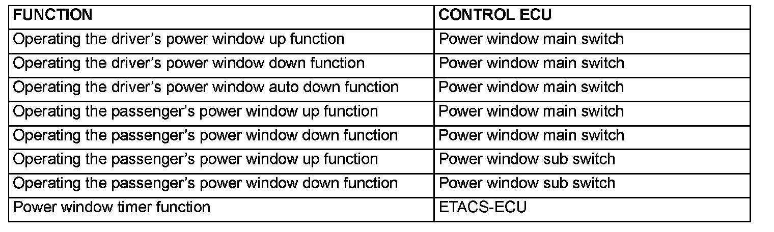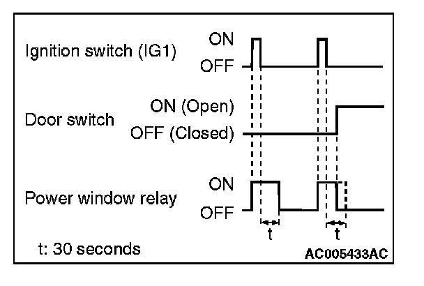 When the ignition switch is turned to the "ON" position, the power window relay are turned ON. After the ignition switch is turned OFF, the system continues to turn ON the power window relay for about 30 seconds and to enable the opening and closing of the door window by the power window relay. When the driver's or front passenger's door is opened while the timer is in operation, the power window relay will be turned OFF.