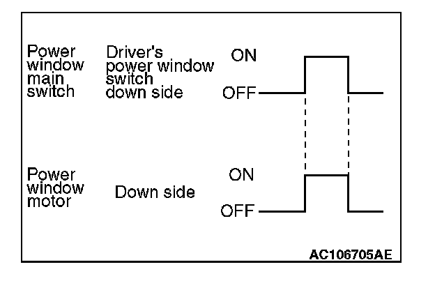 When the driver's power window switch on the power window main switch is pushed down fully, the system energizes its respective power window motor, and then driver's window glass moves to its lowest position.