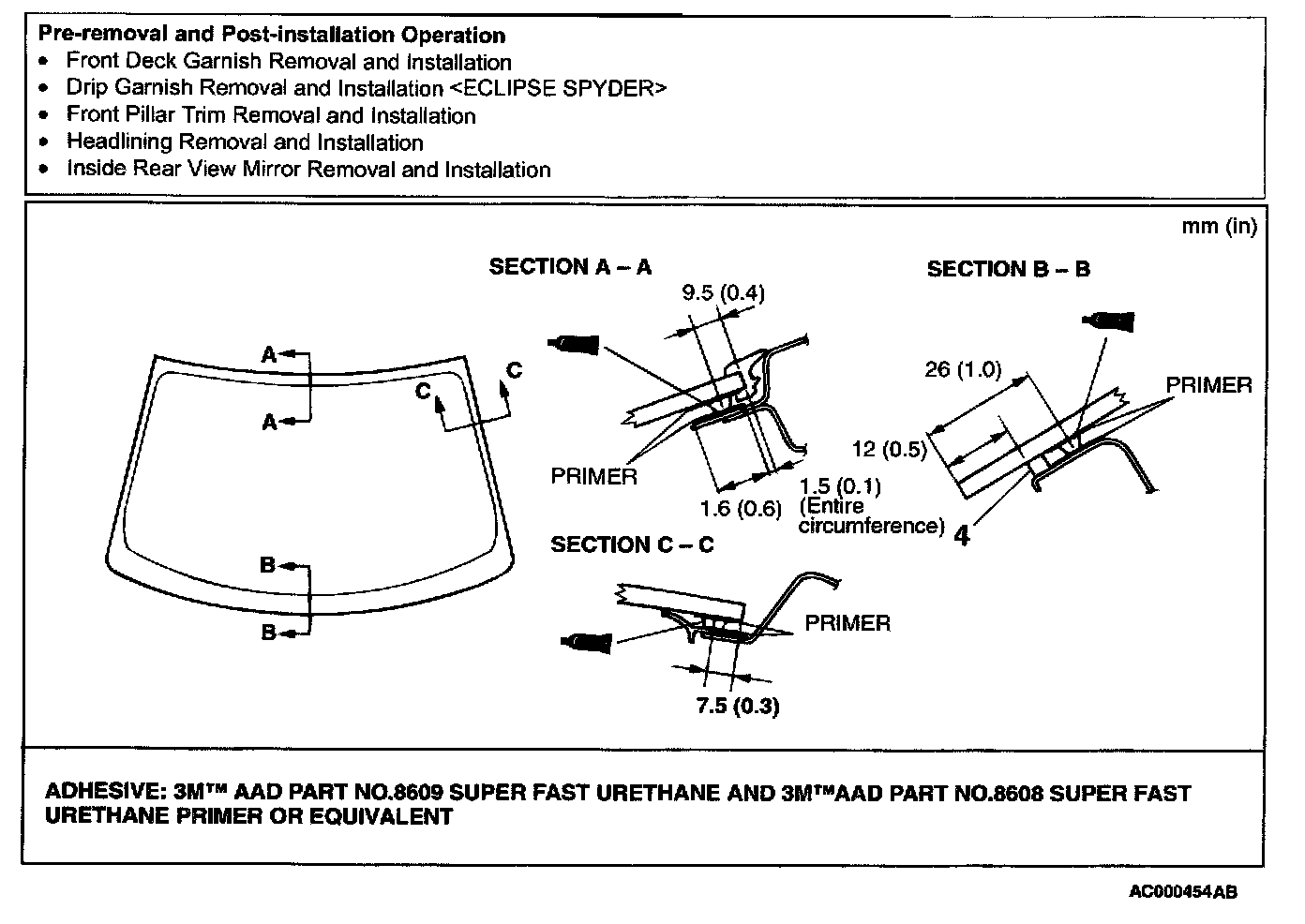 2. Use 3M(TM) AAD Part number 8906 or equivalent to de grease the inside and outside of the windshield and the body flanges.