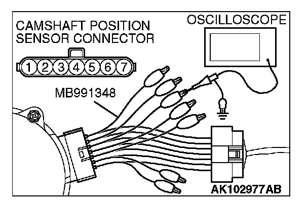 1. Disconnect the camshaft position sensor connector, and connect the test harness special tool (MB991348) in between. (All terminals should be connected.)