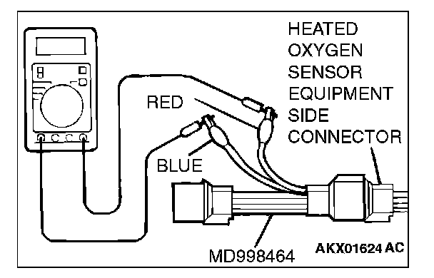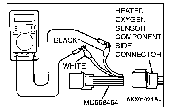 1. Disconnect the heated oxygen sensor connector and connect special tool MD998464 to the connector on the heated oxygen sensor side.