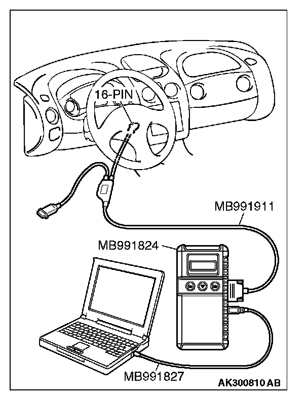 CAUTION: To prevent damage to scan tool MB991958, always turn the ignition switch to the "LOCK" (OFF) position before connecting or disconnecting scan tool MB991958.