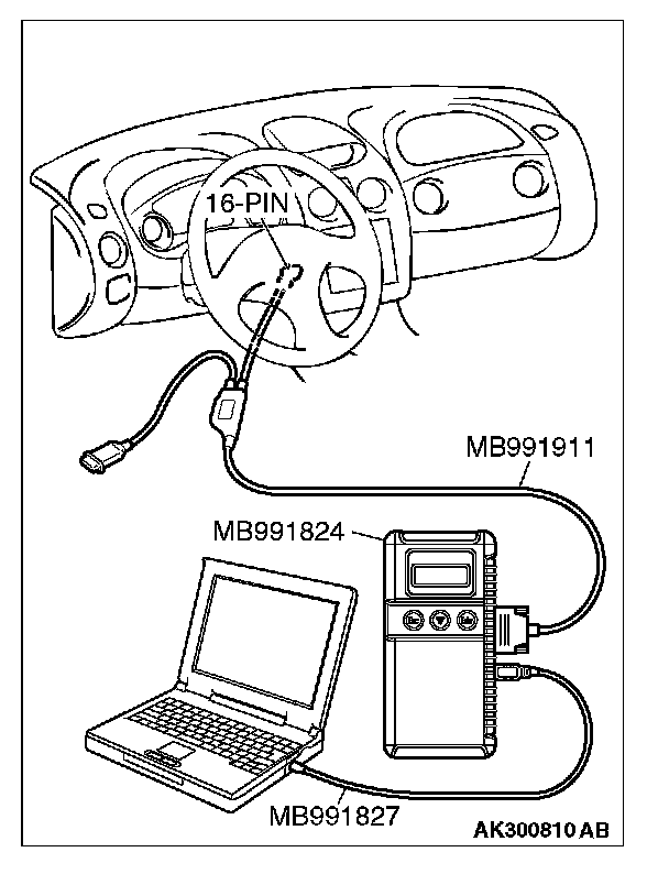 CAUTION: To prevent damage to scan tool MB991958, always turn the ignition switch to the "LOCK" (OFF) position before connecting or disconnecting scan tool MB991958.