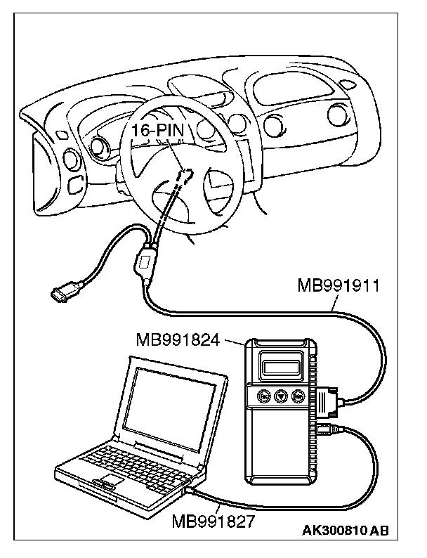 CAUTION: To prevent damage to scan tool MB991958, always turn the ignition switch to the "LOCK" (OFF) position before connecting or disconnecting scan tool MB991958.