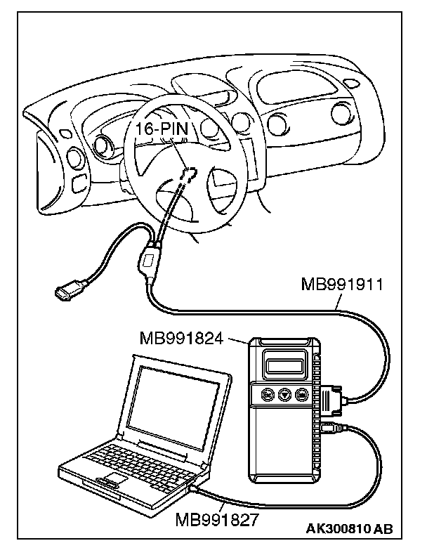 CAUTION: To prevent damage to scan tool MB991958, always turn the ignition switch to the "LOCK" (OFF) position before connecting or disconnecting scan tool MB991958.