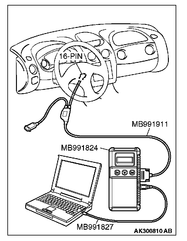 CAUTION: To prevent damage to scan tool MB991958, always turn the ignition switch to the "LOCK" (OFF) position before connecting or disconnecting scan tool MB991958.