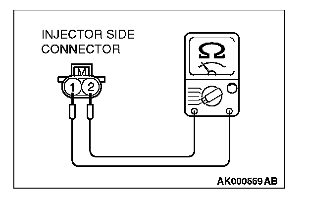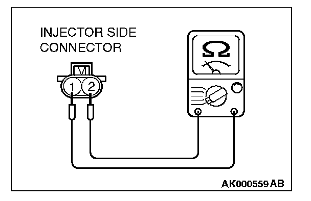 2. Measure the resistance between each injector side connector terminals No. 1 and No. 2.