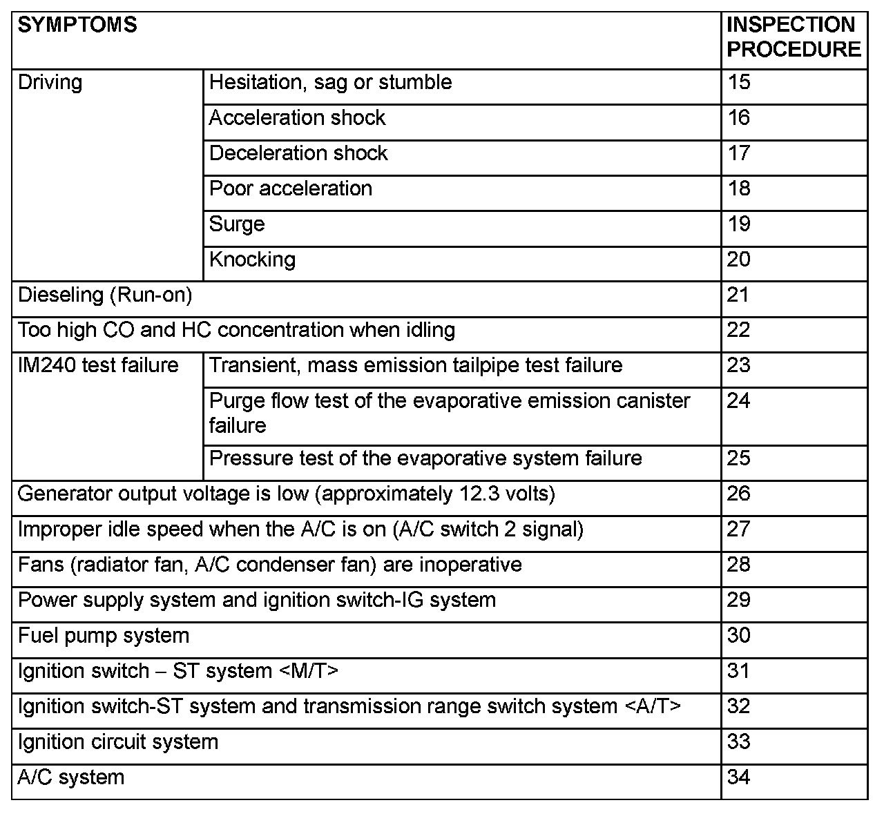Problems Symptoms Table (For Your Information) Part 2: