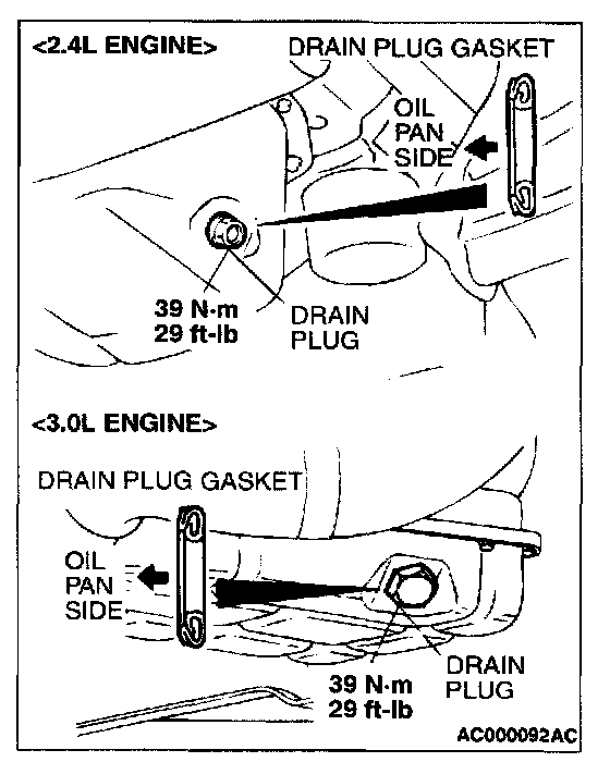 3. Replace the drain plug gasket with a new one, and then tighten the drain plug to the specified torque.