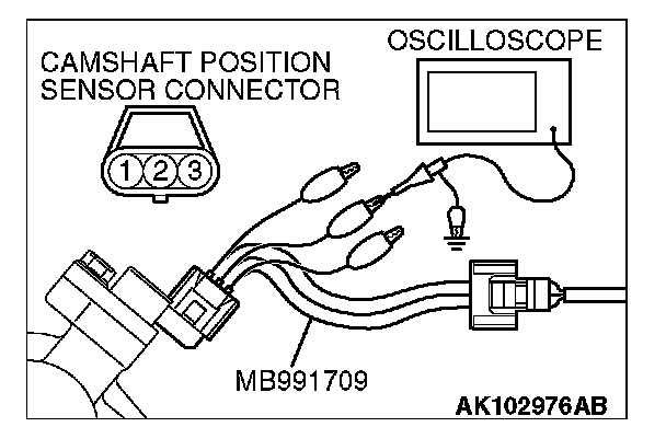 1. Disconnect the camshaft position sensor connector, and connect the test harness special tool (MB991709) between the separated connector (All terminals should be connected).