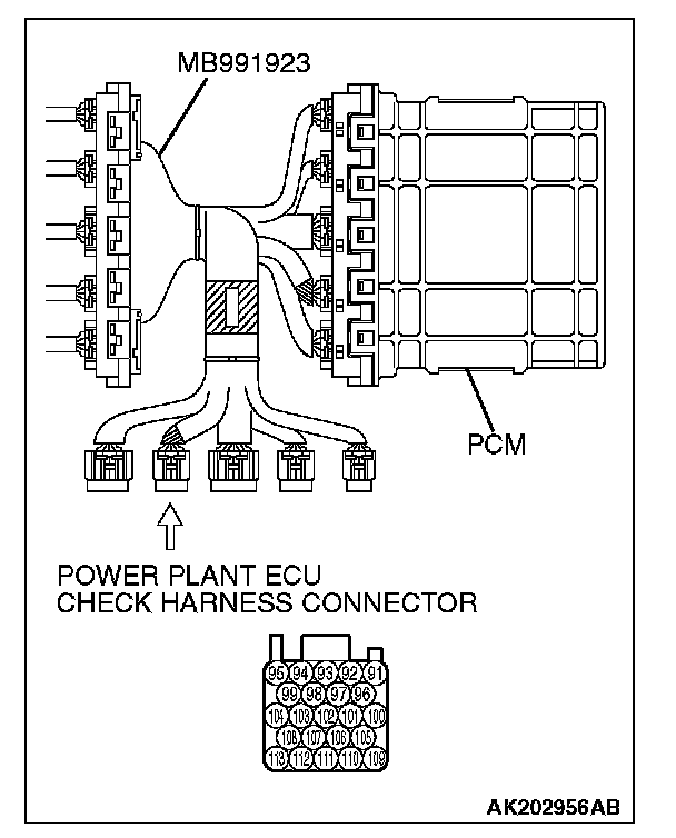 1. Disconnect the all PCM connectors, and connect check harness special tool (MB991923) between the separated connectors.