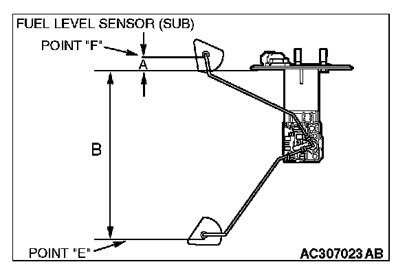 1. Move the float and measure height A at point "F" (highest) and B at point "E" (lowest).