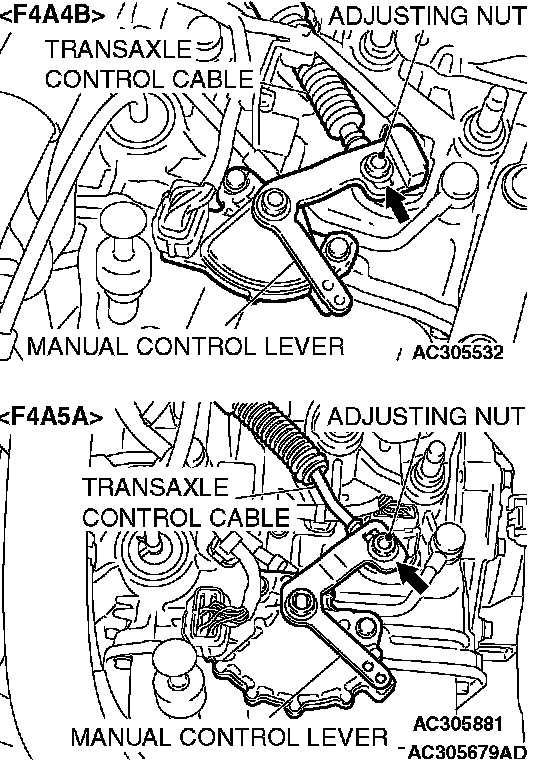 6. Gently push the transaxle control cable in the direction of the arrow, until the cable is taut. Tighten the adjusting nut.