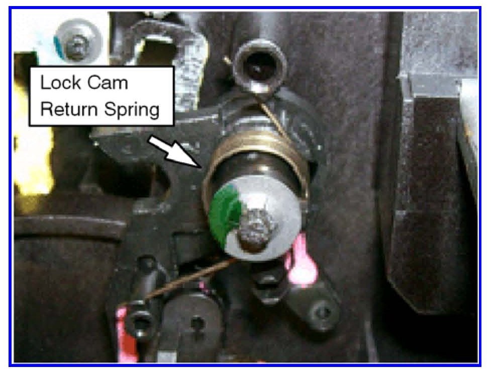 1. Confirm whether the vehicle is equipped with a lock cam return spring. If so, it is not necessary to continue with this rework. Reassemble the floor console in the reverse order of disassembly and submit a Campaign Claim for 0.4 hrs and do not claim for parts. See the Recall Campaign Claim Information section for details. If there is no return spring, continue with Lock Cam Replacement below.