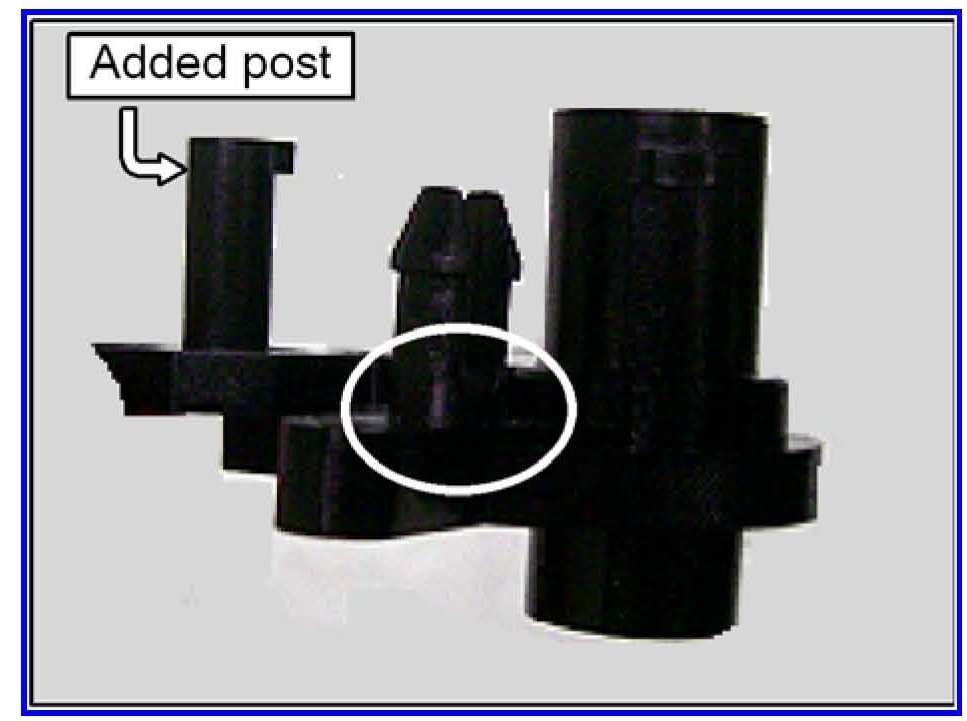 A new lock cam is included in the parts kit. It is not used unless the vehicle's lock cam is broken. Inspect the "split" post on the lock cam in the area indicated for breakage or weakened material (tang is overly flexible).
