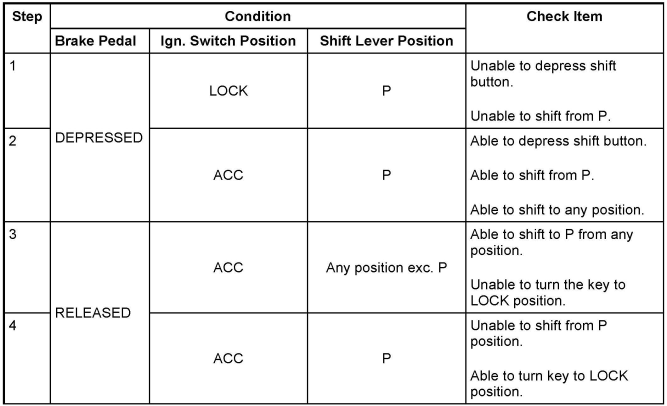SHIFT LOCK SYSTEM FUNCTION INSPECTIONPerform the following shift lock system function check BEFORE floor console reassembly. Shift gears between P and N to insure that the key cannot be removed unless the transmission selector is in the P position. Insure that the shifter moves smoothly when different gear selections are made.