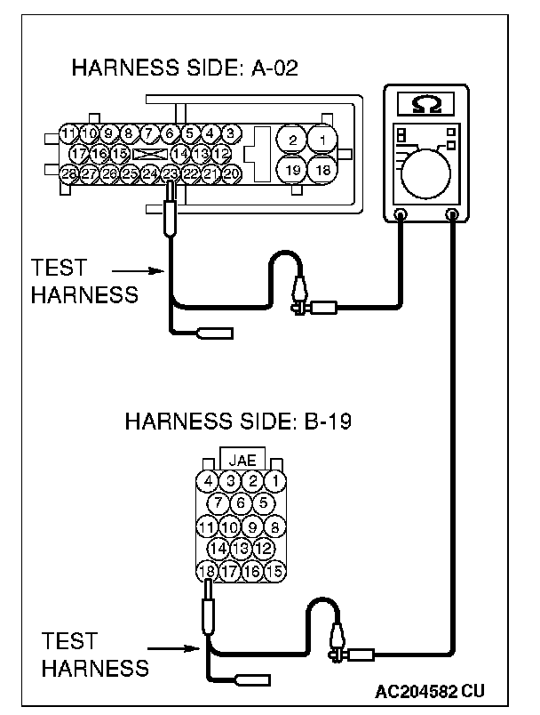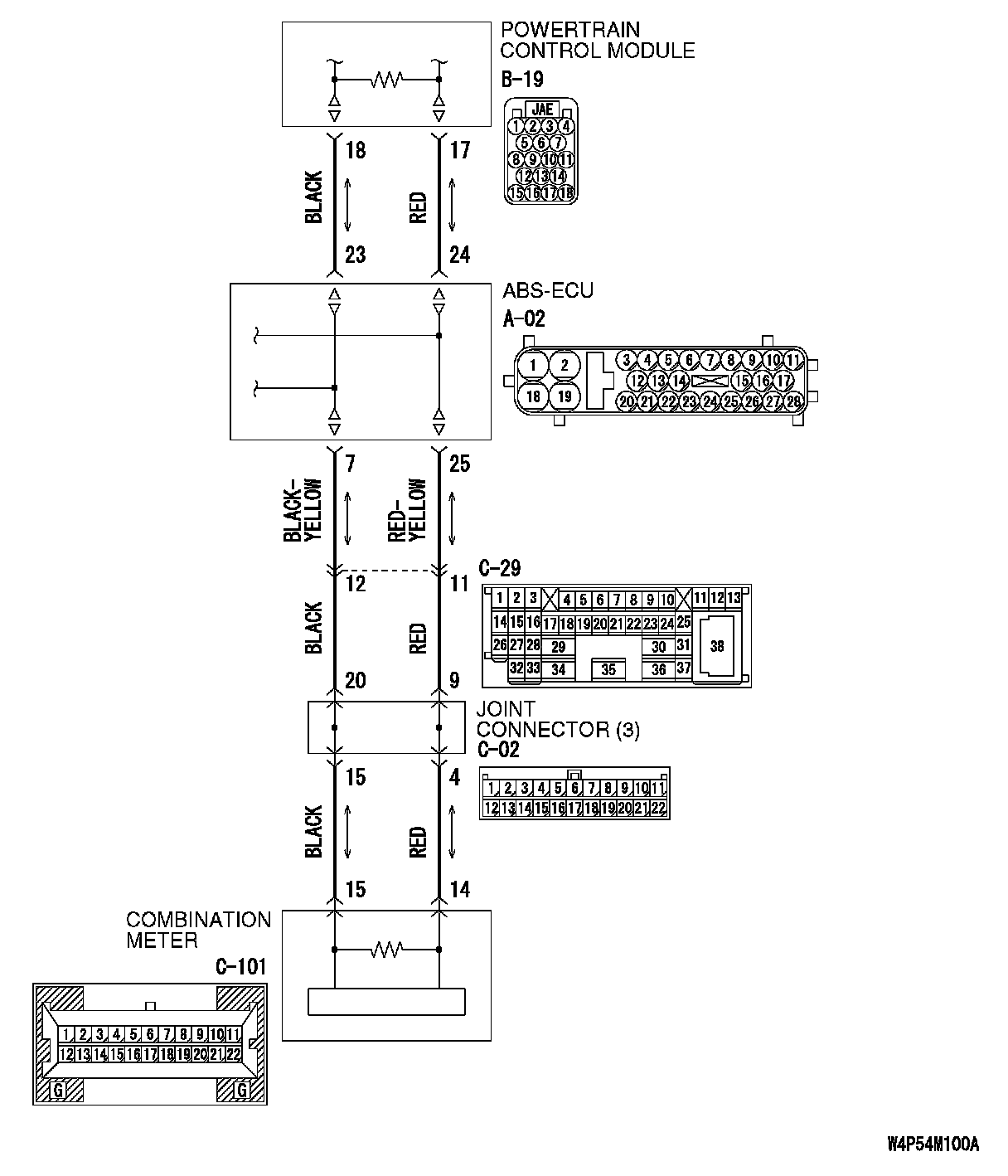 1. Disconnect ABS-ECU connector A-02 and powertrain control module connector B-19, and measure the resistance between each wiring harness side connector.