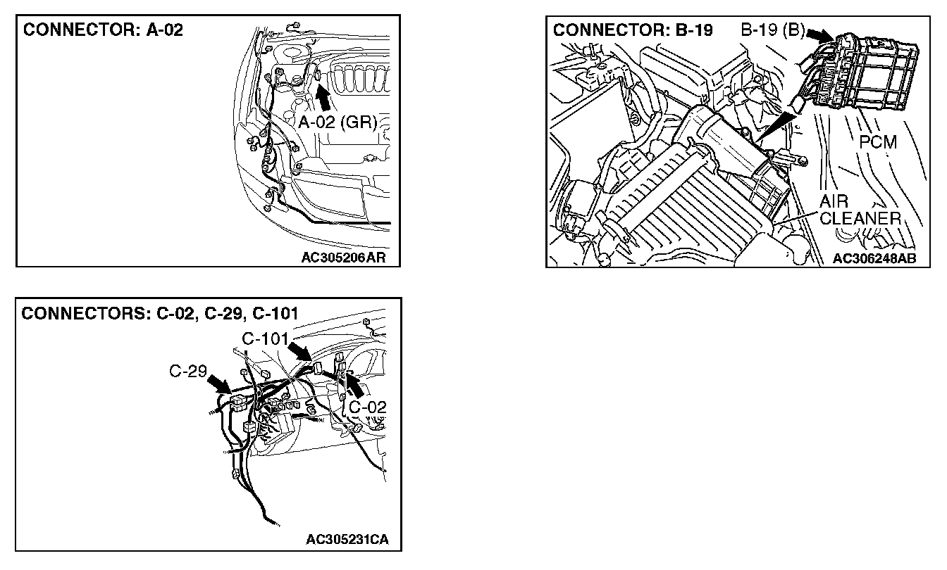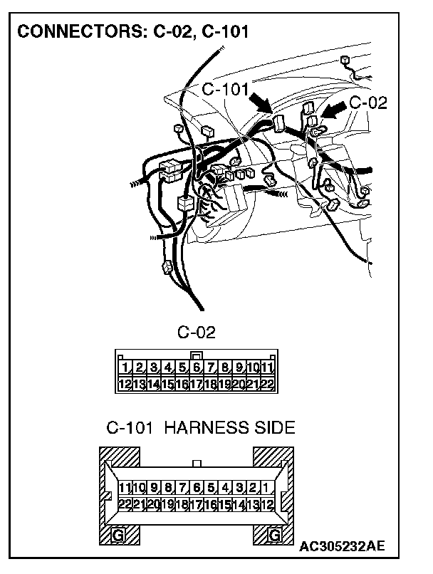 STEP 3. Check joint connector (3) C-02 and combination meter connector C-101 for loose, corroded or damaged terminals, or terminals pushed back in the connector.