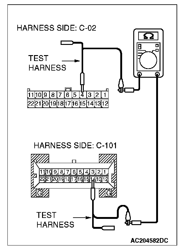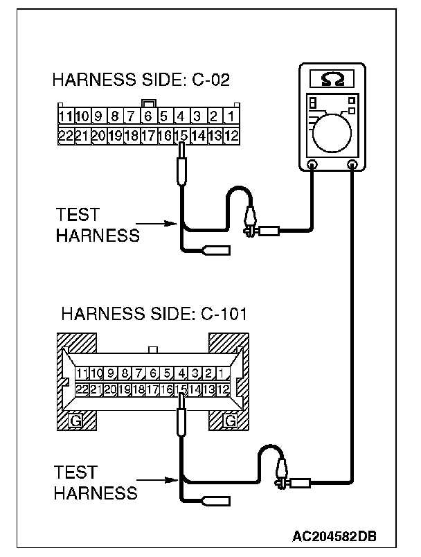 1. Disconnect joint connector (3) C-02 and combination meter connector C-101, and measure the resistance between each wiring harness side connector.