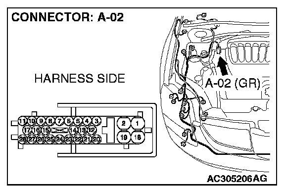 1. Disconnect ABS-ECU connector A-02, and measure the resistance at the wiring harness side of ABS-ECU connector A-02.