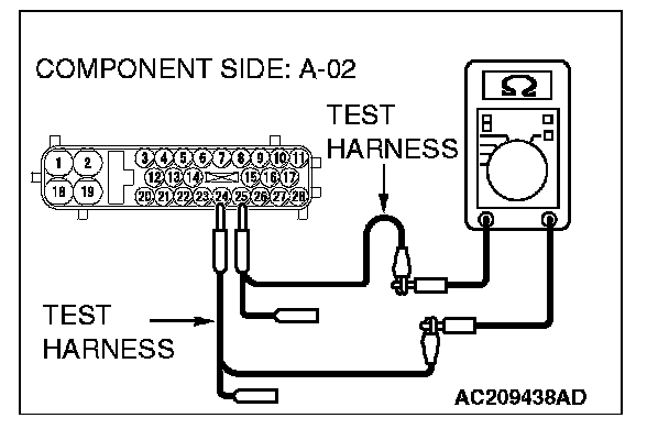 1. Disconnect ABS-ECU connector A-02, and measure the resistance at the component side of ABS-ECU connector A-02.