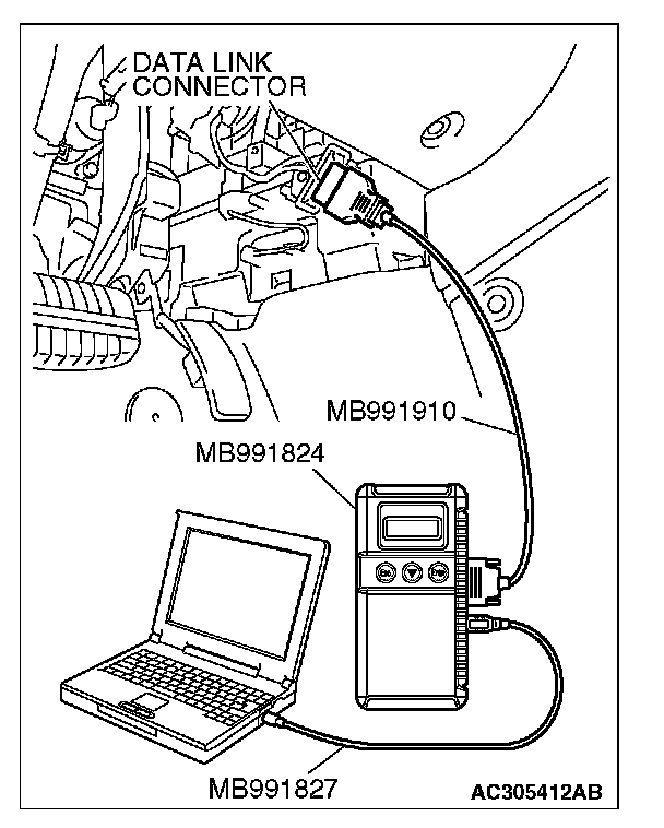 CAUTION: To prevent damage to scan tool MB991958, always turn the ignition switch to the "LOCK" (OFF) position before connecting or disconnecting scan tool MB991958.