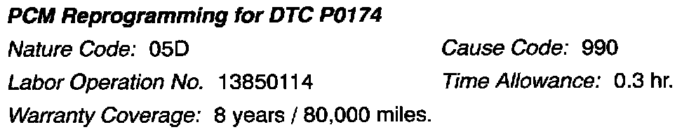 Incorrect PCM software parameters may cause the MIL to turn on and Diagnostic Trouble Code P0174 to set. To eliminate this condition, reprogram the PCM as described in this bulletin.