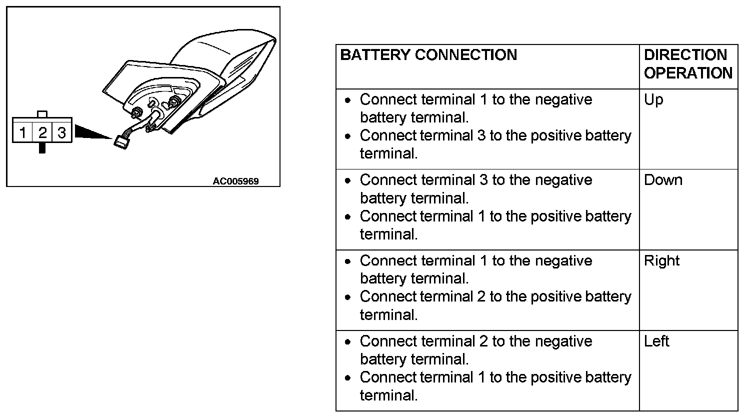 check that the mirror as described in the table when each terminal is connected to the battery.
