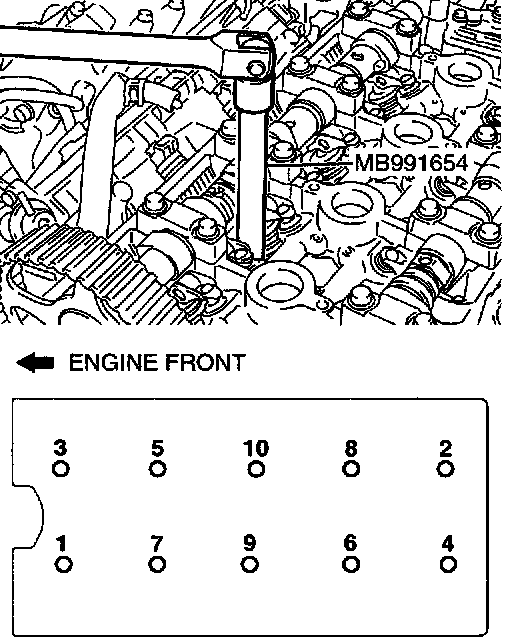 Using special tool MB991654, loosen the cylinder head bolts in two or three steps in the order shown in the illustration.