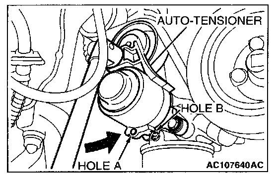 1. Securely insert the spindle handle or ratchet handle with a 12.7 mm (1/2-inch) insertion angle into the jig hole of the auto-tensioner, and turn the auto-tensioner counterclockwise until it hits the stopper.