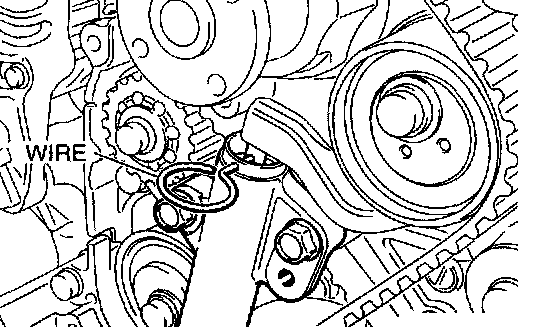 10. Insert wire or pin removed in Step 7 again, and ensure that it can be pulled out easily. When wire or pin can be easily removed, appropriate tension is applied on timing belt. In this case, remove wire or pin.